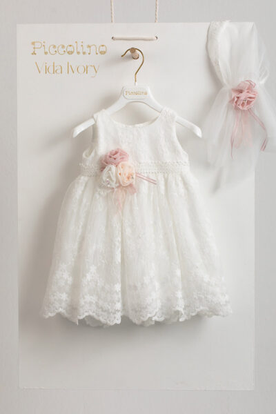 Βαπτιστικό φόρεμα Piccolino Vida Ivory, Φόρεμα απο δαντέλα με όμορφο τελείωμα στο κάτω μέρος. Το ντεκόρ του φορέματος αποτελείται απο χειροποίητα λουλούδια, μαραμπού, πέρλες και δαντέλα. Το φόρεμα συνοδέυεται απο μπαντάνα με ντεκόρ όμοιο με το φόρεμα. Διαθέσιμο σε 4 μεγέθη: 6-12, 12-18, 18-24, 24-36(εξτρά χρέωση)