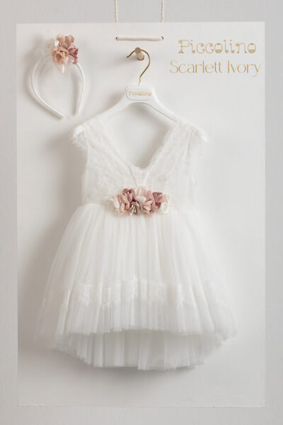 Βαπτιστικό φόρεμα Piccolino Scarlett Ivory. Φόρεμα με μπούστο από δαντέλα σε σχήμα V, ζωνάκι από λεπτές περλίτσες και τούλινη φούστα με σχέδιο από δαντέλα όμοια του πάνω μέρους του φορέματος. Πλάτη σε σχήμα V με δαντέλα . Το ντεκόρ του φορέματος αποτελείται απο χειροποίητα λουλούδια. Το φόρεμα συνοδέυεται απο στέκα με ντεκόρ όμοιο με το φόρεμα. Διαθέσιμο σε 4 μεγέθη: 6-12, 12-18, 18-24, 24-36(εξτρά χρέωση)