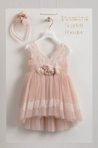 Βαπτιστικό φόρεμα Piccolino Scarlett Powder. Φόρεμα με μπούστο από δαντέλα σε σχήμα V, ζωνάκι από λεπτές περλίτσες και τούλινη φούστα με σχέδιο από δαντέλα όμοια του πάνω μέρους του φορέματος. Πλάτη σε σχήμα V με δαντέλα . Το ντεκόρ του φορέματος αποτελείται απο χειροποίητα λουλούδια. Το φόρεμα συνοδέυεται απο στέκα με ντεκόρ όμοιο με το φόρεμα. Διαθέσιμο σε 4 μεγέθη: 6-12, 12-18, 18-24, 24-36(εξτρά χρέωση)