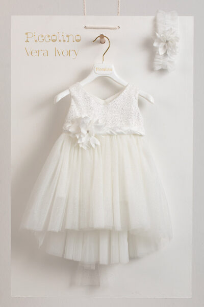 Βαπτιστικό φόρεμα Piccolino Vera Ivory. Μπούστο απο τούλι με ιδιαίτερο σχέδιο από ασημί γκλίτερ με λαιμόκοψη σε σχήμα καρδιάς. Ασύμμετρη τούλινη φούστα με ασημί γκλίτερ. Πλεξούδα ζωνάκι στη μέση αποτελούμενο από σατέν και τούλι με γκλίτερ, με δέσιμο πίσω. Το ντεκόρ του φορέματος αποτελείται απο εντυπωσιάκο χειροποίητο λουλούδι. Το φόρεμα συνοδέυεται απο κορδέλα με ντεκόρ όμοιο με το φόρεμα. Διαθέσιμο σε 4 μεγέθη: 6-12, 12-18, 18-24, 24-36(εξτρά χρέωση)