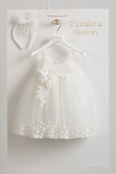 Βαπτιστικό φόρεμα Piccolino Jolanda Ivory. Φόρεμα απο εκρού πουά ανάγλυφο τούλι. Πλάτη με δέσιμο χιαστί απο τις τιράντες. Το ντεκόρ του φορέματος αποτελείται απο χειροποίητα λουλούδια. Το φόρεμα συνοδέυεται απο κορδέλα με ντεκόρ όμοιο με το φόρεμα. Διαθέσιμο σε 4 μεγέθη: 6-12, 12-18, 18-24, 24-36(εξτρά χρέωση)