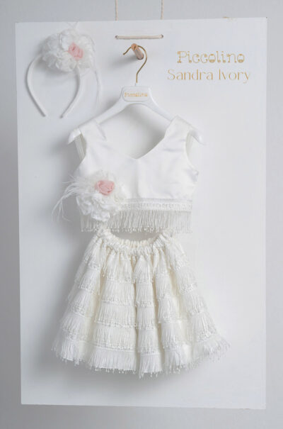 Βαπτιστικό φόρεμα Piccolino Sandra Ivory. Σετ Φούστα – Μπλούζα. Σατεν μπούστο με δαντέλα και κρόσια στο τελειωμά του και ξεχωριστή Φούστα με δαντέλα με σειρές από κρόσια. Το ντεκόρ του φορέματος αποτελείται απο χειροποίητα λουλούδια και πούπουλα. Το φόρεμα συνοδέυεται απο στέκα με ντεκόρ όμοιο με το φόρεμα. Διαθέσιμο σε 4 μεγέθη: 6-12, 12-18, 18-24, 24-36(εξτρά χρέωση)