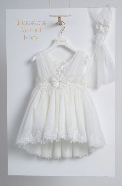 DR25S157.IVORY Βαπτιστικό φόρεμα Piccolino Isabelle Ivory, Το ρομαντικό αυτό ντε πιες ρούχο αποτελείται από δύο κομμάτια από το μπούστο με την ανάγλυφη δαντέλα με τις μαργαρίτες και τούλινα μανικάκια και από την ασσύμετρη τούλινη φούστα 2 επιπέδων με πιο μακρύ το πίσω μέρος της. Το ντεκόρ του φορέματος αποτελείται απο το ζωνάκι στη φούστα που δένει σε φιογκάκι στο μπροστινό μέρος. Το φόρεμα συνοδέυεται απο μπαντάνα με ντεκόρ όμοιο με το φόρεμα. Διαθέσιμο σε 4 μεγέθη: 6-12, 12-18, 18-24, 24-36(εξτρά χρέωση)