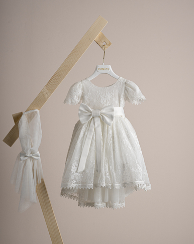 DR25S150.IVORY Βαπτιστικό φόρεμα Piccolino Michele Ivory, Φόρεμα απο δαντέλα με όμορφο τελείωμα στο κάτω μέρος, η εντυπωσιακή του πλάτη καταλήγει σε V και την διακοσμεί ένας σατέν φιόγκος κάτω από τον οποίο υπάρχει μία τούλινη ΄΄ουρά΄΄. Το ντεκόρ του φορέματος αποτελείται απο χειροποίητα λουλούδια. Το φόρεμα συνοδέυεται απο κορδέλα με ντεκόρ όμοιο με το φόρεμα. Διαθέσιμο σε 4 μεγέθη: 6-12, 12-18, 18-24, 24-36(εξτρά χρέωση)