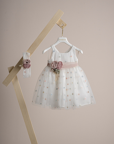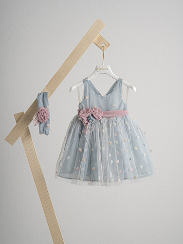 Βαπτιστικό φόρεμα Piccolino Jolanda Powder. Φόρεμα απο powder πουά ανάγλυφο τούλι. Πλάτη με δέσιμο χιαστί απο τις τιράντες. Το ντεκόρ του φορέματος αποτελείται απο χειροποίητα λουλούδια. Το φόρεμα συνοδέυεται απο κορδέλα με ντεκόρ όμοιο με το φόρεμα. Διαθέσιμο σε 4 μεγέθη: 6-12, 12-18, 18-24, 24-36(εξτρά χρέωση)