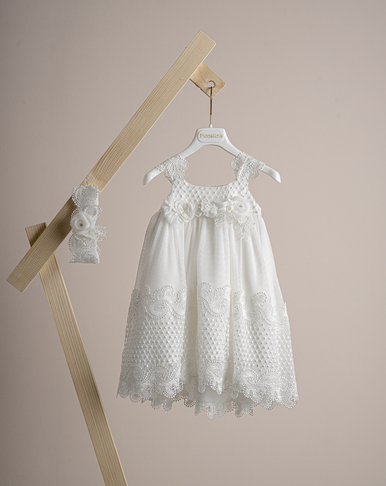 DR24S133.IVORY Βαπτιστικό φόρεμα Piccolino Maria Ivory. Τούλινο μπούστο, με τιράντες δαντέλα σε σχήμα V που καταλήγουν στην μέση στο μπροστά και στο πίσω μέρος του φορέματος. Λεπτό διακριτικό ζωνάκι πλεξούδα από κορδόνια στη μέση και τούλινη φούστα με δαντέλα στο τελείωμα και πιο μακρύ το πίσω μέρος. Το ντεκόρ του φορέματος αποτελείται απο χειροποίητα λουλούδια . Το φόρεμα συνοδέυεται απο κορδέλα με ντεκόρ όμοιο με το φόρεμα. Διαθέσιμο σε 4 μεγέθη: 6-12, 12-18, 18-24, 24-36(εξτρά χρέωση)