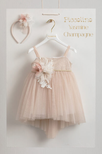 Βαπτιστικό φόρεμα Piccolino Yasmine Champagne. Μπούστο και τιράντες απο τούλι με στρας .Τούλινη φούστα με γκλίτερ, ασσύμετρη με μακρυά ουρά. Το ντεκόρ του φορέματος αποτελείται απο εντυπωσιακά χειροποίητα λουλούδια, πέρλες και δαντέλα. Το φόρεμα συνοδέυεται απο στέκα με ντεκόρ όμοιο με το φόρεμα. Διαθέσιμο σε 4 μεγέθη: 6-12, 12-18, 18-24, 24-36(εξτρά χρέωση)