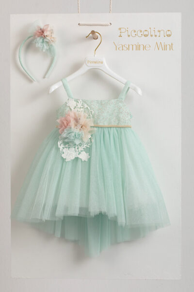 Βαπτιστικό φόρεμα Piccolino Yasmine Mint. Μπούστο και τιράντες απο τούλι με στρας .Τούλινη φούστα με γκλίτερ, ασσύμετρη με μακρυά ουρά. Το ντεκόρ του φορέματος αποτελείται απο εντυπωσιακά χειροποίητα λουλούδια, πέρλες και δαντέλα. Το φόρεμα συνοδέυεται απο στέκα με ντεκόρ όμοιο με το φόρεμα. Διαθέσιμο σε 4 μεγέθη: 6-12, 12-18, 18-24, 24-36(εξτρά χρέωση)