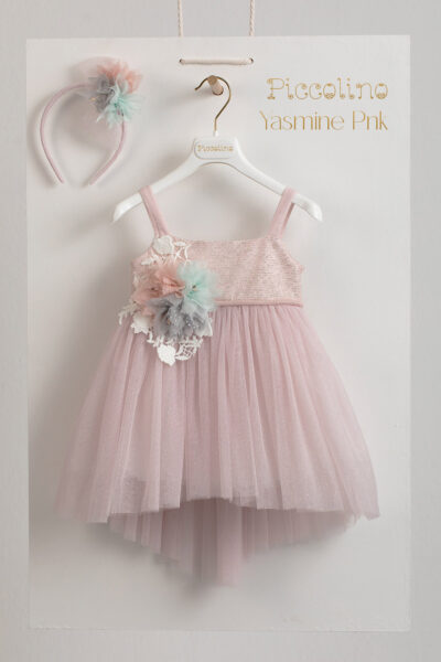 Βαπτιστικό φόρεμα Piccolino Yasmine Pink. Μπούστο και τιράντες απο τούλι με στρας .Τούλινη φούστα με γκλίτερ, ασσύμετρη με μακρυά ουρά. Το ντεκόρ του φορέματος αποτελείται απο εντυπωσιακά χειροποίητα λουλούδια, πέρλες και δαντέλα. Το φόρεμα συνοδέυεται απο στέκα με ντεκόρ όμοιο με το φόρεμα. Διαθέσιμο σε 4 μεγέθη: 6-12, 12-18, 18-24, 24-36(εξτρά χρέωση)