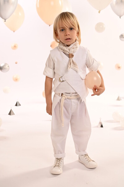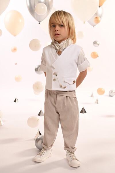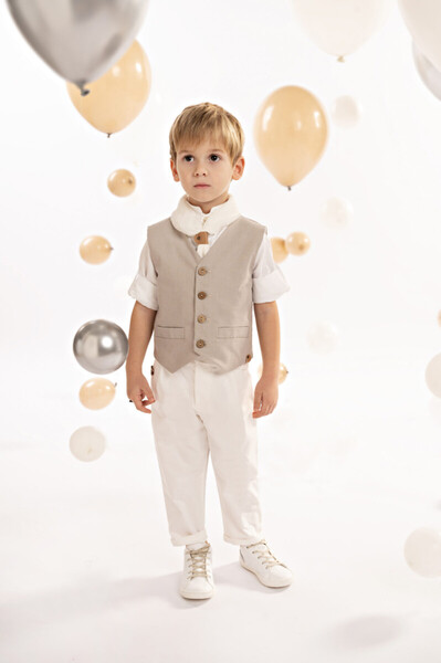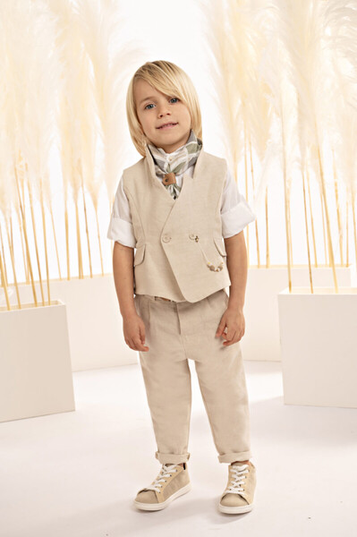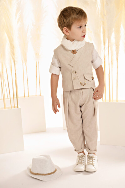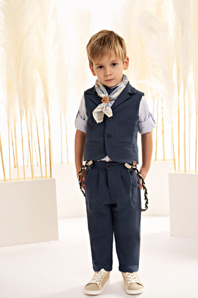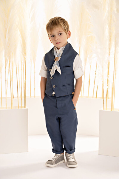 125001 Ένα σύνολο που αποπνέει κομψότητα και διαχρονικό στυλ, ιδανικό για κάθε ξεχωριστή περίσταση! Φτιαγμένο από 100% λινό ύφασμα σε cobalt blue απόχρωση, περιλαμβάνει δίπιετο παντελόνι με τσέπες φιλέτο και ένα κομψό γιλέκο με πέτο, που προσδίδει μια αίσθηση ρετρό φινέτσας. Το βαμβακερό oxford πουκάμισο σε σιέλ χρώμα, με κλασικό γιακά και καφέ κουμπάκια, συμπληρώνει αρμονικά το σύνολο. Οι ιδιαίτερες λεπτομέρειες κάνουν τη διαφορά: το ασορτί μπλε παπιγιόν, το personalized βουάλ φουλάρι με γεωμετρικά σχέδια σε σιέλ-μπεζ αποχρώσεις, οι δίχρωμες τιράντες και το ψάθινο καπέλο (ή τραγιάσκα κατά επιλογή) συνθέτουν ένα look που ισορροπεί ανάμεσα στην κομψότητα και τη διακριτική πολυτέλεια.