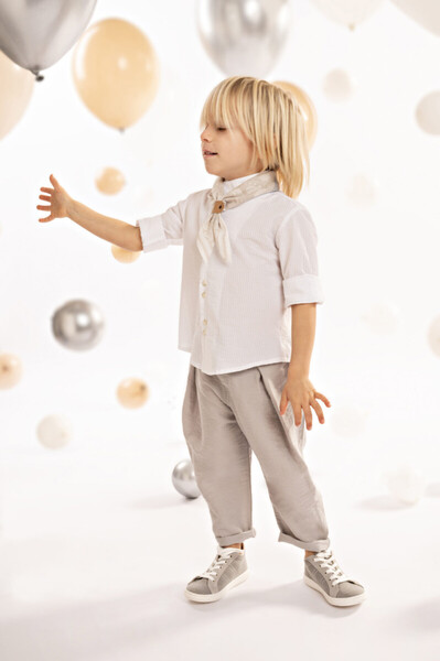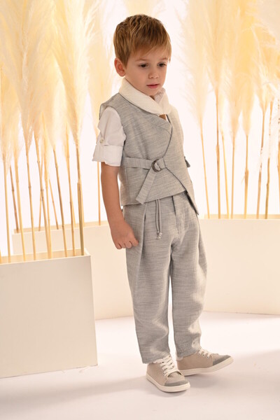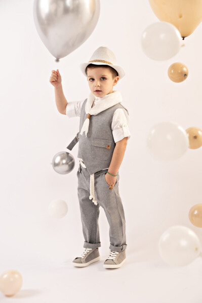 125026 Μια εκλεπτυσμένη πρόταση που συνδυάζει διαχρονικό στυλ και ιδιαίτερο design. Το σύνολο περιλαμβάνει παντελόνι δίπιετο με έξτρα λοξή ζώνη, σε γκρι απόχρωση από βαμβακερή καμπαρντίνα, συνδυασμένο με γιλέκο σε κλασική γραμμή με έξυπνα κοψίματα, από μελανζέ γκρι cotton-lino ύφασμα. Το βαμβακερό πουκάμισο σε off white απόχρωση διαθέτει κλασικό γιακά και δένει άψογα με το ασορτί δίχρωμο παπιγιόν, το υπέροχο πλισέ φουλάρι σε off white χρώμα και το ψάθινο καπέλο ή τραγιάσκα (ανάλογα με την προτίμηση).