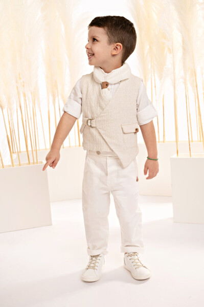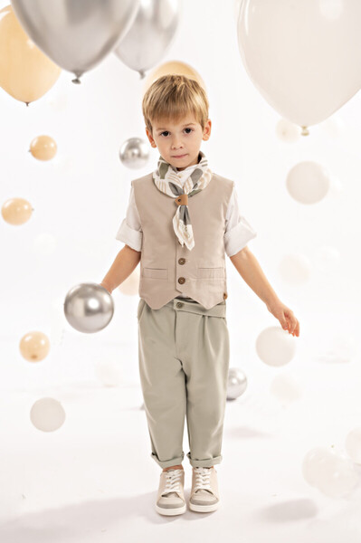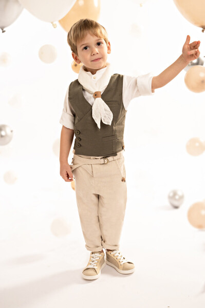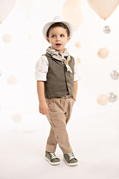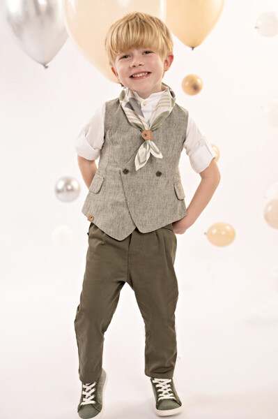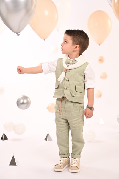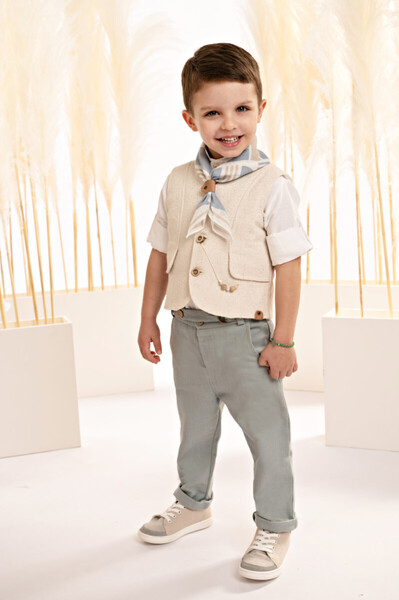 125019 Ένα σύνολο που αποπνέει κομψότητα και φινέτσα. Το δίπιετο παντελόνι, με τσέπες φιλέτα, και το γιλέκο σε κλασική γραμμή, με έξυπνα κοψίματα, είναι φτιαγμένα από υπέροχο 100% λινό ύφασμα σε χρώμα ευκαλύπτου. Το βαμβακερό πουκάμισο σε off white απόχρωση με κλασικό γιακά, ολοκληρώνει την απλότητα και την κομψότητα του συνόλου. Το σετ αναδεικνύεται με το ασορτί δίχρωμο παπιγιόν, το φουλάρι σε off white από βαμβακερή υφαντή γάζα, τη ζώνη από μπεζ κορδόνι και το ψάθινο καπέλο ή τραγιάσκα (ανάλογα με την προτίμηση), προσφέροντας μια αψεγάδιαστη εμφάνιση.