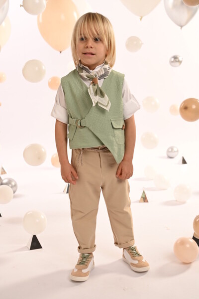 125020 Ένα σύνολο που ξεχωρίζει για τις ιδιαίτερες γραμμές και τον κομψό συνδυασμό αποχρώσεων. Το παντελόνι, με το μοναδικό κόψιμο στο πίσω μέρος, είναι κατασκευασμένο από twill βαμβακερό ύφασμα σε mint απόχρωση, ενώ το σταυρωτό γιλέκο με λοξό κούμπωμα και φαρδύ μονό πέτο σε μπεζ βαμβακερό ύφασμα προσθέτει μια ξεχωριστή σχεδιαστική πινελιά. Το βαμβακερό πουκάμισο σε off white απόχρωση με τον κλασικό του γιακά δένει αρμονικά με το παπιγιόν και το personalized φουλάρι με γεωμετρικά σχέδια σε μπεζ-λαδί τόνους. Το σύνολο ολοκληρώνεται με τη ζώνη από μπεζ μελανζέ κορδόνι και το ψάθινο καπέλο ή τραγιάσκα (ανάλογα με την προτίμηση) δημιουργώντας ένα άψογο αποτέλεσμα.