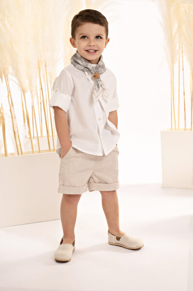 125023 Ένα υπέροχο σύνολο που συνδυάζει άνεση και casual κομψότητα. Η βερμούδα σε loose γραμμή από μπεζ μελανζέ τεχνικό ύφασμα και το βαμβακερό πουκάμισο με mao γιακά και λοξό διπλό κούμπωμα δημιουργούν έναν τέλειο συνδυασμό. Το personalized βουάλ φουλάρι με τα λαχούρια σε μπεζ-γκρι απόχρωση προσφέρει μια ανεπιτήδευτη αίσθηση στυλ, ενώ το ψάθινο καπέλο ή τραγιάσκα (ανάλογα με την προτίμηση) ολοκληρώνει το σύνολο με την απόλυτη καλοκαιρινή διάθεση