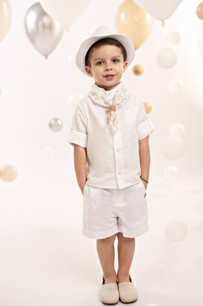 125031 Ένα μοντέρνο σύνολο με καλοκαιρινή αύρα και υπέροχο design που αποτελείται από βερμούδα σε loose γραμμή από tencel-cotton-lino ύφασμα και βαμβακερό πουκάμισο σε off white απόχρωση με πολύ ιδιαίτερο Mao γιακά και εξωτερικό τσεπάκι. Το σετ συμπληρώνει άψογα το personalized βουάλ φουλάρι με τα γεωμετρικά σχέδια σε μπεζ απόχρωση και το ψάθινο καπέλο (ή τραγιάσκα κατά επιλογή).