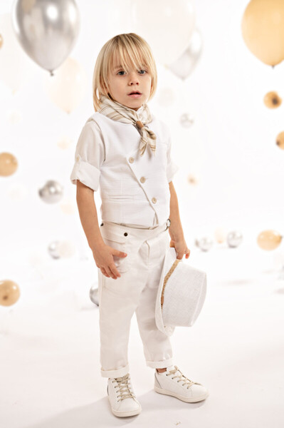 125015 Αυτό το σύνολο συνδυάζει εξαιρετική κομψότητα και φρέσκια αισθητική, με το λευκό βαμβακερό παντελόνι που διαθέτει ιδιαίτερη λεπτομέρεια στο ζωνάκι και το υπέροχο design γιλέκο, σταυρωτό με πατάκια τσέπες και ασυμμετρία στο τελείωμα. Το βαμβακερό πουκάμισο σε off white απόχρωση με κλασσικό γιακά προσδίδει διαχρονική κομψότητα, ενώ το παπιγιόν και το υφαντό ριγέ φουλάρι σε off white-μπεζ αποχρώσεις προσφέρουν μία σικάτη ολοκλήρωση. Το ψάθινο καπέλο (ή τραγιάσκα κατά επιλογή) ολοκληρώνει το look, δίνοντας μία αίσθηση καλοκαιρινής, ανάλαφρης πολυτέλειας.