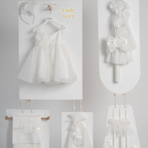Σετ βάπτισης Be Fabulous Emily Ivory. Περιλαμβάνει λαδόπανο (πετσέτα 450gsm και σεντόνι 70*140εκ, εσώρουχα και πετσέτα ιερέα), λαμπάδα στολισμένη, στολισμό συσκευασίας (μπραντς), λαδοσέτ (στολισμένα 3κεράκια, μπουκαλάκι,σαπούνι) .Το ρούχο δεν περιλαμβάνεται στην τιμη του σετ βάπτισης.