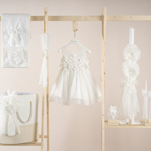 Βαπτιστικό πακέτο Piccolino Carmen ivory περιλαμβάνει φόρεμα ,σετ λαδόπανα, λαμπάδα, λαδοσετ και στολισμένη τσάντα καπιτονέ
