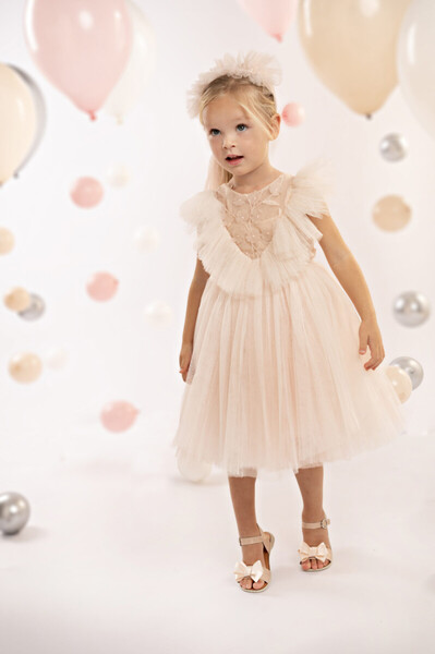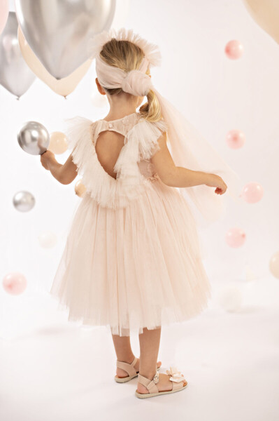125108 Ένα φόρεμα που μοιάζει να έχει ξεπηδήσει από τις σελίδες ενός παραμυθιού! Σε εκρού απόχρωση, φτιαγμένο από υπέροχη κεντητή οργαντίνα με απλικέ λουλούδια και αέρινο πουά κεντητό τούλι. Το μπούστο με την εντυπωσιακή πλάτη, παίζει αρμονικά με τα κοψίματα, τις διαφάνειες και τις υφές, δημιουργώντας μια αέρινη αίσθηση και υπέροχα σχεδιαστικά σχήματα. Η φούστα σαν tutu μπαλαρίνας, είναι πλούσια και εντυπωσιακή, με διπλό βολάν από κεντημένο πουά τούλι, προσθέτοντας όγκο, χάρη και κίνηση σε κάθε βήμα. Το σύνολο ολοκληρώνεται με μια ρομαντική κορδέλα για τα μαλλιά, διακοσμημένη με φιόγκο από τούλι και αέρινα φτερά.