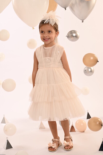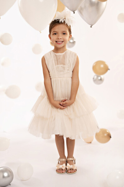 125108 Ένα φόρεμα που μοιάζει να έχει ξεπηδήσει από τις σελίδες ενός παραμυθιού! Σε εκρού απόχρωση, φτιαγμένο από υπέροχη κεντητή οργαντίνα με απλικέ λουλούδια και αέρινο πουά κεντητό τούλι. Το μπούστο με την εντυπωσιακή πλάτη, παίζει αρμονικά με τα κοψίματα, τις διαφάνειες και τις υφές, δημιουργώντας μια αέρινη αίσθηση και υπέροχα σχεδιαστικά σχήματα. Η φούστα σαν tutu μπαλαρίνας, είναι πλούσια και εντυπωσιακή, με διπλό βολάν από κεντημένο πουά τούλι, προσθέτοντας όγκο, χάρη και κίνηση σε κάθε βήμα. Το σύνολο ολοκληρώνεται με μια ρομαντική κορδέλα για τα μαλλιά, διακοσμημένη με φιόγκο από τούλι και αέρινα φτερά.