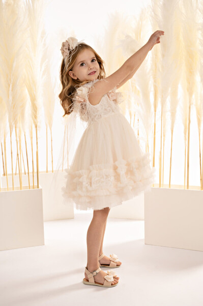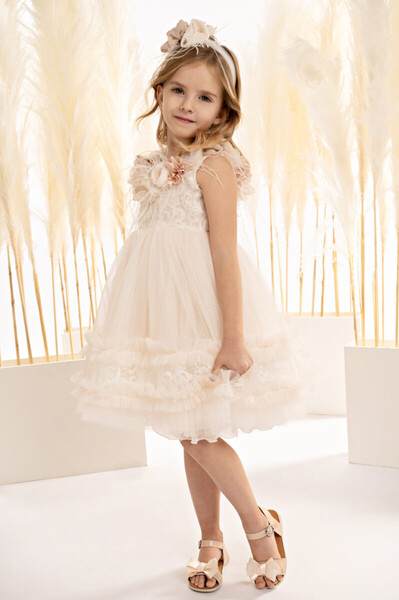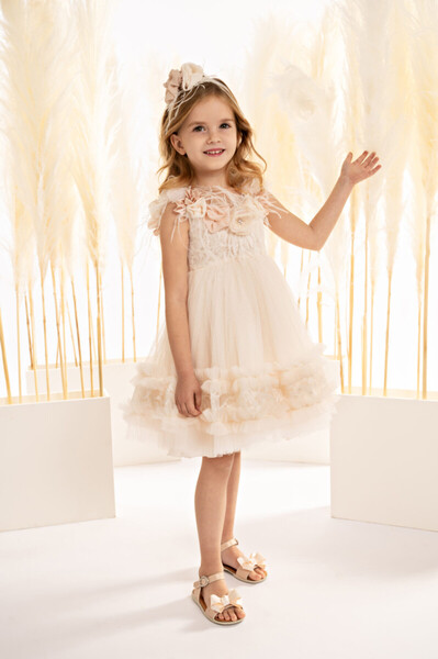 125116 Αυτό το ονειρικό φόρεμα σε απόχρωση misty rose είναι η επιτομή της ρομαντικής κομψότητας. Το μπούστο, φτιαγμένο εξολοκλήρου από ντουμπλαρισμένη δαντέλα, αναδεικνύεται μέσα από την ανοιχτή λαιμόκοψη, περίτεχνα στολισμένη με χειροποίητα λουλούδια εκρού, μπεζ και misty rose. Οι λεπτομέρειες από αέρινα φτερά στρουθοκαμήλου και στρας χαρίζουν μια μαγευτική λάμψη, σαν ψίθυρος πολυτέλειας. Η φούστα, με την πλούσια σούρα από απαλό τούλι και δαντέλα, κινείται με χάρη και ελαφρότητα, ενώ μια σειρά από μικρά βολάν προσθέτει μια παιχνιδιάρικη, ρομαντική πινελιά. Η εμφάνιση ολοκληρώνεται με κορδέλα για τα μαλλιά, διακοσμημένη με τα ίδια φίνα λουλούδια και φτερά, συνθέτοντας ένα σύνολο που θυμίζει παραμυθένιο όνειρο.
