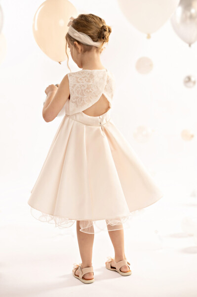 125108 Ένα φόρεμα που μοιάζει να έχει ξεπηδήσει από τις σελίδες ενός παραμυθιού! Σε εκρού απόχρωση, φτιαγμένο από υπέροχη κεντητή οργαντίνα με απλικέ λουλούδια και αέρινο πουά κεντητό τούλι. Το μπούστο με την εντυπωσιακή πλάτη, παίζει αρμονικά με τα κοψίματα, τις διαφάνειες και τις υφές, δημιουργώντας μια αέρινη αίσθηση και υπέροχα σχεδιαστικά σχήματα. Η φούστα σαν tutu μπαλαρίνας, είναι πλούσια και εντυπωσιακή, με διπλό βολάν από κεντημένο πουά τούλι, προσθέτοντας όγκο, χάρη και κίνηση σε κάθε βήμα. Το σύνολο ολοκληρώνεται με μια ρομαντική κορδέλα για τα μαλλιά, διακοσμημένη με φιόγκο από τούλι και αέρινα φτερά.