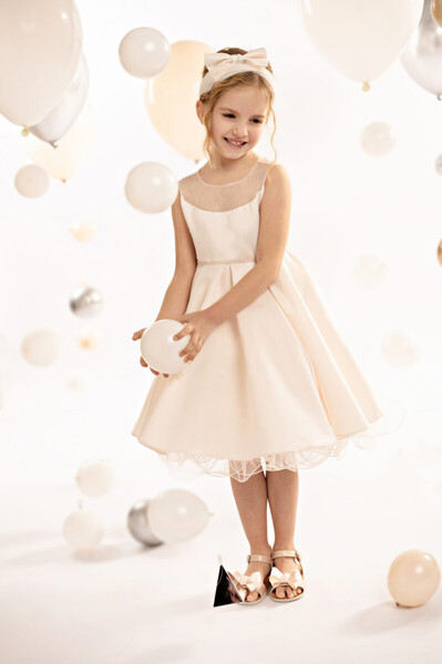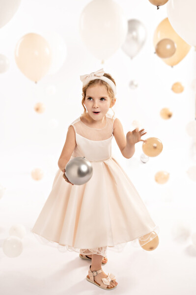 125122 Αυτό το φόρεμα σε pink champagne χρώμα από σατέν ντουσέζ ύφασμα, τούλι και