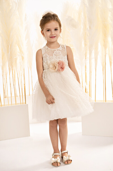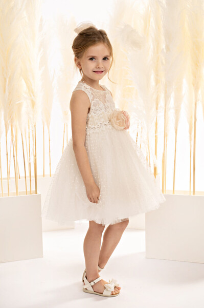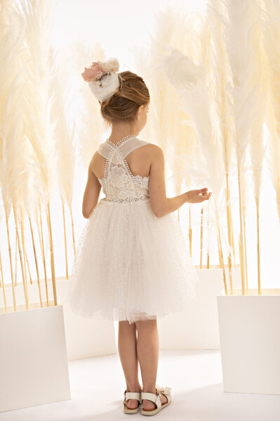 125108 Ένα φόρεμα που μοιάζει να έχει ξεπηδήσει από τις σελίδες ενός παραμυθιού! Σε εκρού απόχρωση, φτιαγμένο από υπέροχη κεντητή οργαντίνα με απλικέ λουλούδια και αέρινο πουά κεντητό τούλι. Το μπούστο με την εντυπωσιακή πλάτη, παίζει αρμονικά με τα κοψίματα, τις διαφάνειες και τις υφές, δημιουργώντας μια αέρινη αίσθηση και υπέροχα σχεδιαστικά σχήματα. Η φούστα σαν tutu μπαλαρίνας, είναι πλούσια και εντυπωσιακή, με διπλό βολάν από κεντημένο πουά τούλι, προσθέτοντας όγκο, χάρη και κίνηση σε κάθε βήμα. Το σύνολο ολοκληρώνεται με μια ρομαντική κορδέλα για τα μαλλιά, διακοσμημένη με φιόγκο από τούλι και αέρινα φτερά.