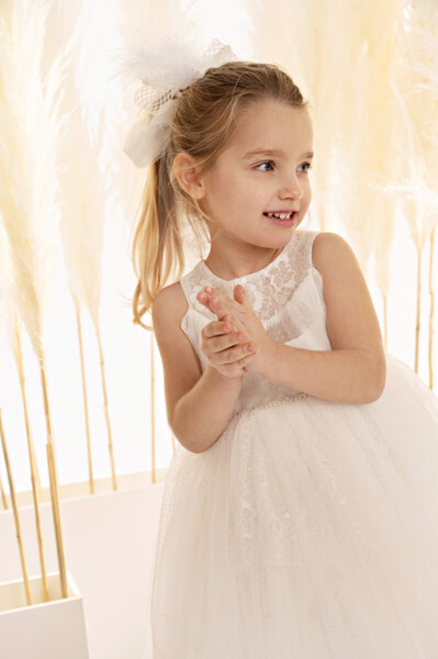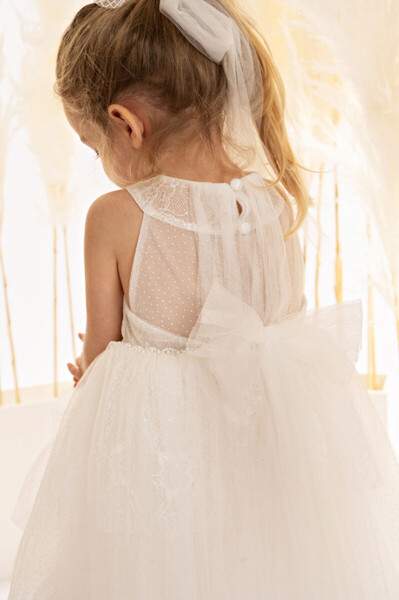 125142 Ένα αέρινο φόρεμα σε off white χρώμα, με εξαιρετικό σχέδιο και υπέροχο συνδυασμό υφασμάτων. Το μπούστο, μπροστά και πίσω, είναι διακοσμημένο με δαντέλα στον λαιμό, ενώ το ντραπέ τούλι πουά παίζει με τις διαφάνειες σε έξυπνα σημεία δημιουργώντας μια παιχνιδιάρικη αίσθηση. Η φούστα, πλούσια με πολλές στρώσεις από μαλακό τούλι, micro πουά τούλι και δαντέλα Chantilly, ενισχύει τη ρομαντική φύση του φορέματος. Στη μέση, μία τρέσα από κεντημένες χάντρες αγκαλιάζει τη σιλουέτα καταλήγοντας σε έναν τούλινο φιόγκο πίσω. Η κορδέλα για τα μαλλιά, στολισμένη και αυτή με έναν εντυπωσιακό φιόγκο, χάντρες και φτερά, ολοκληρώνει την εμφάνιση δίνοντας μία παραμυθένια αίσθηση.