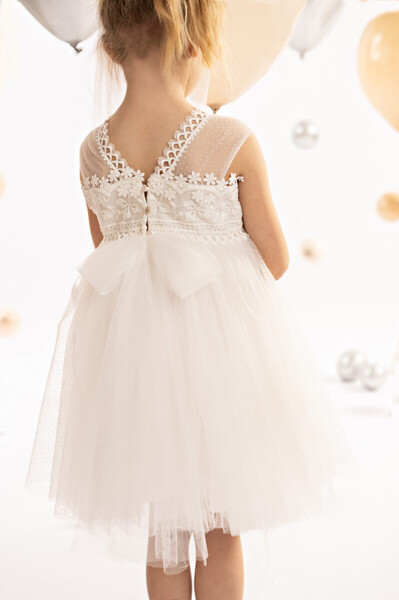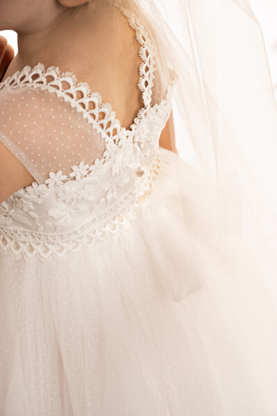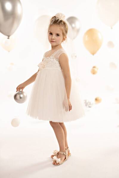 125128 Ένα υπέροχο φόρεμα σε off white χρώμα, φτιαγμένο από μαλακό τούλι και δαντέλα που συνδυάζει την κομψότητα και την ρομαντική παιχνιδιάρικη διάθεση. Το κρουαζέ μπούστο από τούλι στολίζει μοναδικά η τρέσα με τα κρόσσια, ενώ η φούστα με τις πολλές στρώσεις από δαντέλα και τούλι, προσδίδουν όγκο και κίνηση στο φόρεμα. Δύο χειροποίητα τριαντάφυλλα σε ροζ και εκρού αποχρώσεις κοσμούν το μπούστο και την κορδέλα για τα μαλλιά, χαρίζοντας στο σύνολο μια αίσθηση φινέτσας και αρμονίας.
