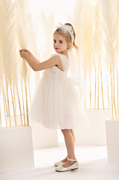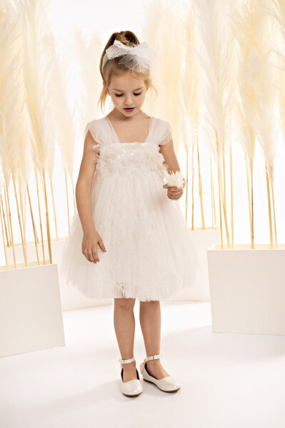 125135 Αυτό το εντυπωσιακό φόρεμα σε off white χρώμα από κεντημένο με τρισδιάστατα απλικέ τριαντάφυλλα ύφασμα και απαλό τούλι, αποπνέει μία αίσθηση πολυτέλειας και μια αύρα ρομαντισμού. Το μπούστο, διακοσμημένο με το ίδιο λουλουδένιο μοτίβο, έχει ένα μανικάκι που αγκαλιάζει το μπράτσο ενώ η ανοιχτή V πλάτη από τούλι προσφέρει μία σαγηνευτική διάφανη λεπτομέρεια. Η πλούσια φούστα, κατασκευασμένη από μαλακό τούλι και τούλι με glitter, προσφέρει όγκο και κίνηση, ενώ η φάσα από το ύφασμα με τα τριαντάφυλλα ολοκληρώνει το τελείωμα με μία ρομαντική, μαγευτική αίσθηση. Η κορδέλα για τα μαλλιά, στολισμένη με τα ίδια λουλούδια από το φόρεμα και φτερά, προσθέτει την τελευταία, εκλεπτυσμένη πινελιά σε αυτό το υπέροχο σύνολο.