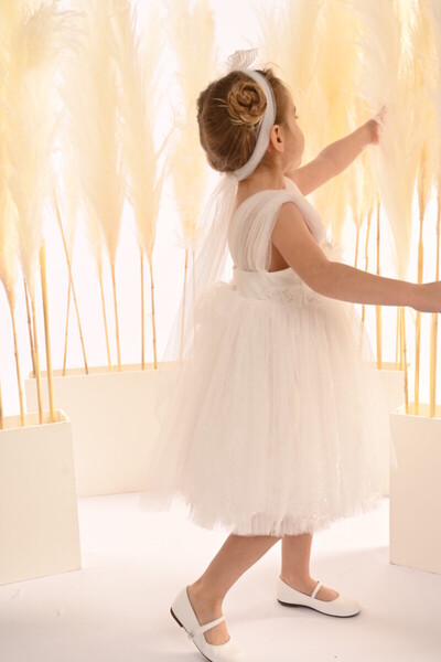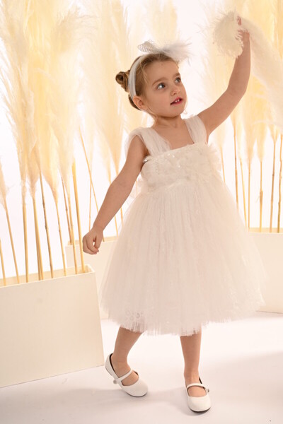125119 Ένα ονειρεμένο αμπίρ φόρεμα σε λευκό χρώμα, με μπούστο φτιαγμένο από δαντέλα και φαρδιές τιράντες από micro πουά τούλι. Η φούστα με πλούσιες σούρες από δαντέλα και glitter τούλι χαρίζει αέρινη κίνηση και λάμψη. Η ζώνη από τούλι, που δένει πίσω, στολίζεται υπέροχα με δύο χειροποίητα διακοσμητικά τριαντάφυλλα από σατέν σε ροζ και εκρού χρώμα, προσθέτοντας μια ρομαντική πινελιά τόσο στο φόρεμα όσο και στην ασορτί κορδέλα μαλλιών. Όλα τα φορέματα διαθέτουν βαμβακερή φόδρα και φουρό.