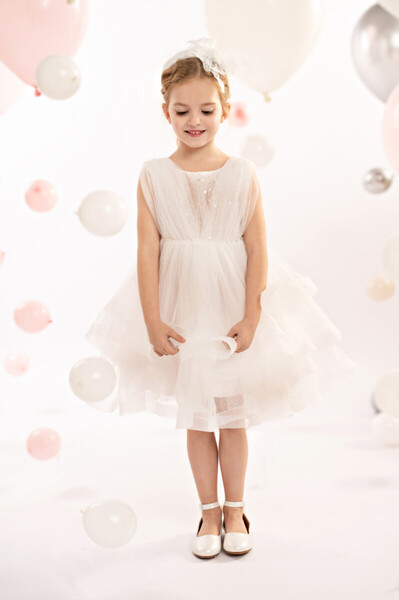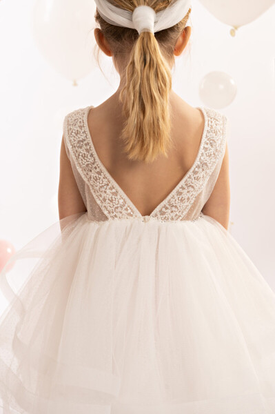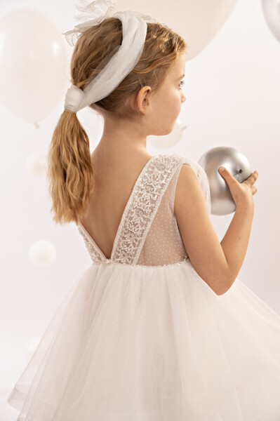125119 Ένα ονειρεμένο αμπίρ φόρεμα σε λευκό χρώμα, με μπούστο φτιαγμένο από δαντέλα και φαρδιές τιράντες από micro πουά τούλι. Η φούστα με πλούσιες σούρες από δαντέλα και glitter τούλι χαρίζει αέρινη κίνηση και λάμψη. Η ζώνη από τούλι, που δένει πίσω, στολίζεται υπέροχα με δύο χειροποίητα διακοσμητικά τριαντάφυλλα από σατέν σε ροζ και εκρού χρώμα, προσθέτοντας μια ρομαντική πινελιά τόσο στο φόρεμα όσο και στην ασορτί κορδέλα μαλλιών. Όλα τα φορέματα διαθέτουν βαμβακερή φόδρα και φουρό.
