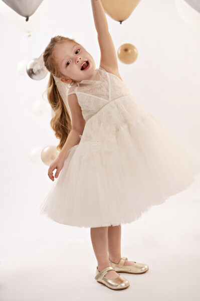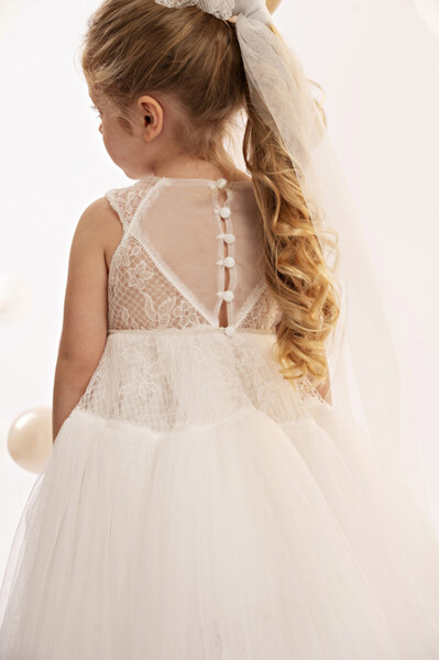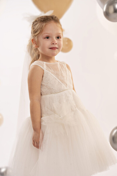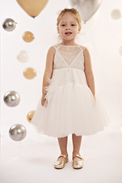 125108 Ένα φόρεμα που μοιάζει να έχει ξεπηδήσει από τις σελίδες ενός παραμυθιού! Σε εκρού απόχρωση, φτιαγμένο από υπέροχη κεντητή οργαντίνα με απλικέ λουλούδια και αέρινο πουά κεντητό τούλι. Το μπούστο με την εντυπωσιακή πλάτη, παίζει αρμονικά με τα κοψίματα, τις διαφάνειες και τις υφές, δημιουργώντας μια αέρινη αίσθηση και υπέροχα σχεδιαστικά σχήματα. Η φούστα σαν tutu μπαλαρίνας, είναι πλούσια και εντυπωσιακή, με διπλό βολάν από κεντημένο πουά τούλι, προσθέτοντας όγκο, χάρη και κίνηση σε κάθε βήμα. Το σύνολο ολοκληρώνεται με μια ρομαντική κορδέλα για τα μαλλιά, διακοσμημένη με φιόγκο από τούλι και αέρινα φτερά.