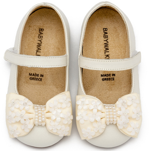 BW4862-IVORY1 Δερμάτινο Γοβάκι Μονή Μπαρέτα Χρατς με Gros Grain Φιογκάκι και Λουλουδάκια σε Εκρού Χρώμα