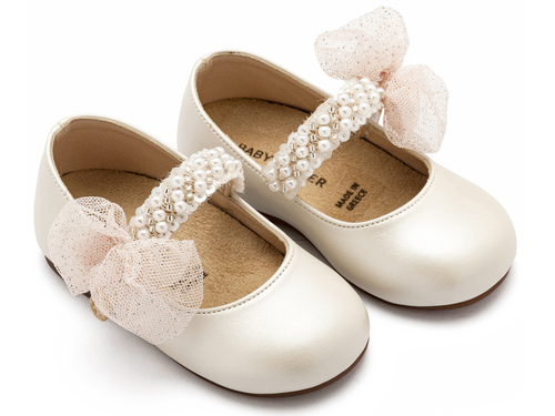 BS3596-IVORY1 Δερμάτινο Γοβάκι Μονή Μπαρέτα Διακοσμημένη με Χειροποίητο Τούλινο Διακοσμητικό σε Εκρού Χρώμα