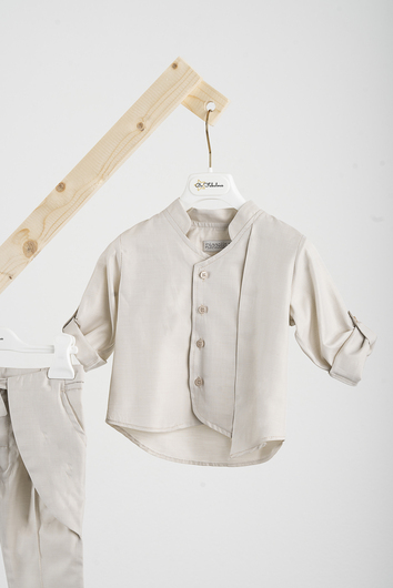 BFA25S16.BEIGE Κοστούμι Piccolino Josua σε χρώμα Beige. Περιλαμβάνει βισκόζη πουκαμίσα σε ιδιαίτερο κόψιμο με πιέτα, παντελόνι βισκόζη μέ ένα εξίσου ιδιαίτερο κόψιμο και ζωνάκι. Διαθέσιμο σε 4 μεγέθη 6-12, 12-18, 18-24, 24-36(εξτρά χρέωση)