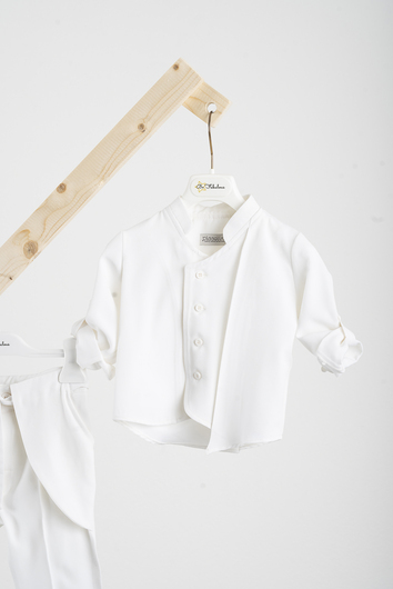 BFA25S16.IVORY Κοστούμι Piccolino Josua σε χρώμα Ivory. Περιλαμβάνει βισκόζη πουκαμίσα σε ιδιαίτερο κόψιμο με πιέτα, παντελόνι βισκόζη μέ ένα εξίσου ιδιαίτερο κόψιμο και ζωνάκι. Διαθέσιμο σε 4 μεγέθη 6-12, 12-18, 18-24, 24-36(εξτρά χρέωση)