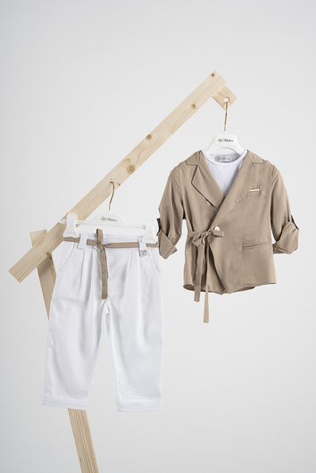 BFA25S17.MOCHA Κοστούμι Piccolino Stefan σε χρώμα Mocha. Περιλαμβάνει βισκόζη πουκαμίσα με δέσιμο με ζωνάκι, βαμβακερό λευκό μπλουζάκι, παντελόνι λινό βράκα με πιέτες λευκό, ζωνάκι και φουλάρι. Διαθέσιμο σε 4 μεγέθη 6-12, 12-18, 18-24, 24-36(εξτρά χρέωση)