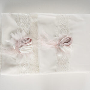 Σετ λαδόπανα Piccolino LK-YASMINE PINK. Αποτελείται απο βαμβακερό λαδόπανο, πετσέτα 140*70εκ, εσώρουχα και πετσέτα ιερέα 30*50εκ. Στολισμένα με χειροποίητα υφασμάτινα λουλούδια. Συνοδευτικό του φορέματος Piccolino YASMINE PINK