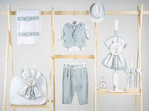 Βαπτιστικό πακέτο Piccolino Emanuel ciele περιλαμβάνει κοστούμι ,σετ λαδόπανα, λαμπάδα, λαδοσετ και στολισμένη τσάντα λευκή