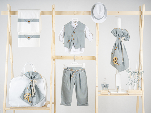 Βαπτιστικό πακέτο Piccolino Enrique teal περιλαμβάνει κοστούμι ,σετ λαδόπανα, λαμπάδα, λαδοσετ και στολισμένη τσάντα λευκή