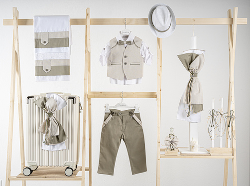 Βαπτιστικό πακέτο Piccolino Francisco sage περιλαμβάνει κοστούμι ,σετ λαδόπανα, λαμπάδα, λαδοσετ και στολισμένη βαλίτσα CREAM