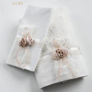 Σετ λαδόπανα Piccolino LK-ARIADNE IVORY. Αποτελείται απο βαμβακερό λαδόπανο, πετσέτα 140*70εκ, εσώρουχα και πετσέτα ιερέα 30*50εκ. Στολισμένα με χειροποίητα υφασμάτινα λουλούδια. Συνοδευτικό του φορέματος Piccolino ARIADNE Ivory