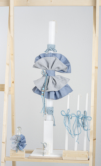 Βαπτιστικό πακέτο Piccolino Gustavo light blue περιλαμβάνει κοστούμι ,σετ λαδόπανα, λαμπάδα, λαδοσετ και στολισμένη τσάντα λευκή