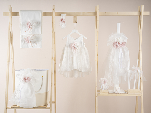 Βαπτιστικό πακέτο Piccolino Beatrice ivory περιλαμβάνει φόρεμα ,σετ λαδόπανα, λαμπάδα, λαδοσετ και στολισμένo καλάθι