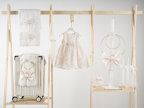 Βαπτιστικό πακέτο Piccolino Carmen peach περιλαμβάνει φόρεμα ,σετ λαδόπανα, λαμπάδα, λαδοσετ και στολισμένη βαλίτσα pink