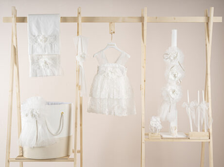 Βαπτιστικό πακέτο Piccolino Estelle ivory περιλαμβάνει φόρεμα ,σετ λαδόπανα, λαμπάδα, λαδοσετ και στολισμένo καλάθι