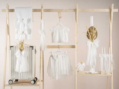 Βαπτιστικό πακέτο Piccolino Isabelle ivory περιλαμβάνει φόρεμα ,σετ λαδόπανα, λαμπάδα, λαδοσετ και στολισμένη βαλίτσα ecru