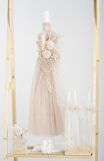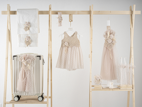 Βαπτιστικό πακέτο Piccolino Thea beige περιλαμβάνει φόρεμα ,σετ λαδόπανα, λαμπάδα, λαδοσετ και στολισμένη βαλίτσα ecru